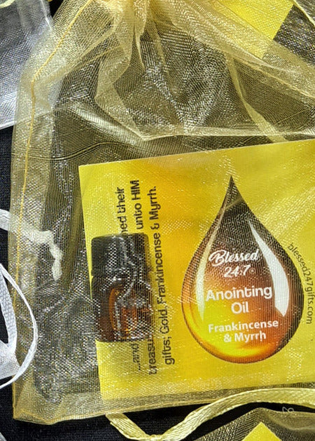 #3 Frankincense & Myrrh Anointing Oil 1 miniature amber glass 2ml 5/8 dram bottle filled with Frankincense & Myrrh. Comes in gold organza bag with note card and scripture reference to having the faith as small as a mustard seed