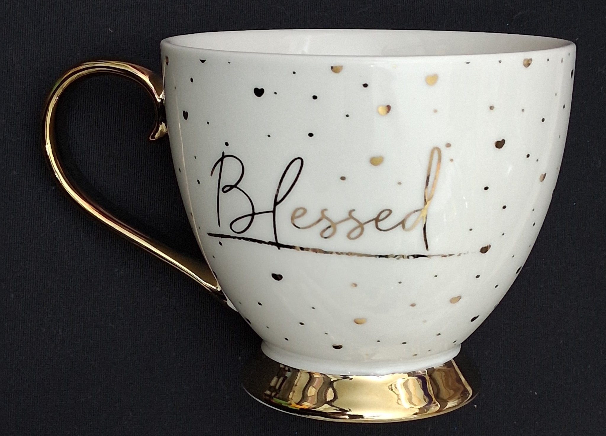 14oz Footed Porcelain Mug (hand wash). Because of gold accents this mug is not microwave safe)