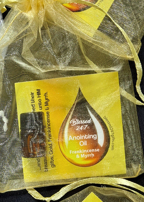 Frankincense & Myrrh Anointing Oil Gift. 1 miniature amber glass 2ml 5/8 dram bottle filled with Frankincense & Myrrh.  Comes in gold organza bag with note card and scripture reference.